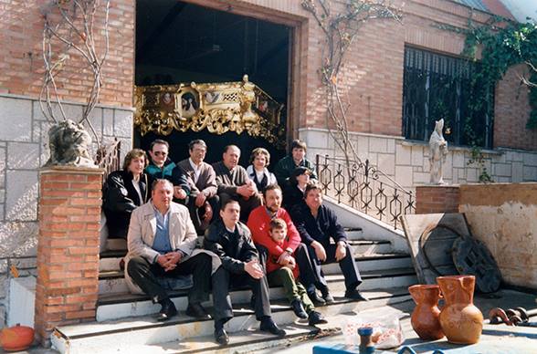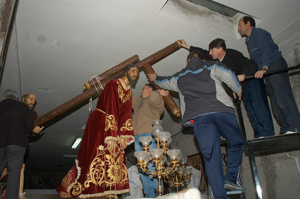 En 1989 se comienza el gran proyecto de realizar un nuevo paso para la imagen de Jesús de Nazareno, encargándolo al taller de imaginería Dorrego. En las fotografía podemos observar a miembros de la Junta de Cofradías y los trabajos de dorado en el trono. El nuevo paso y faldón se estrenarán el 20 de Marzo de 1990.